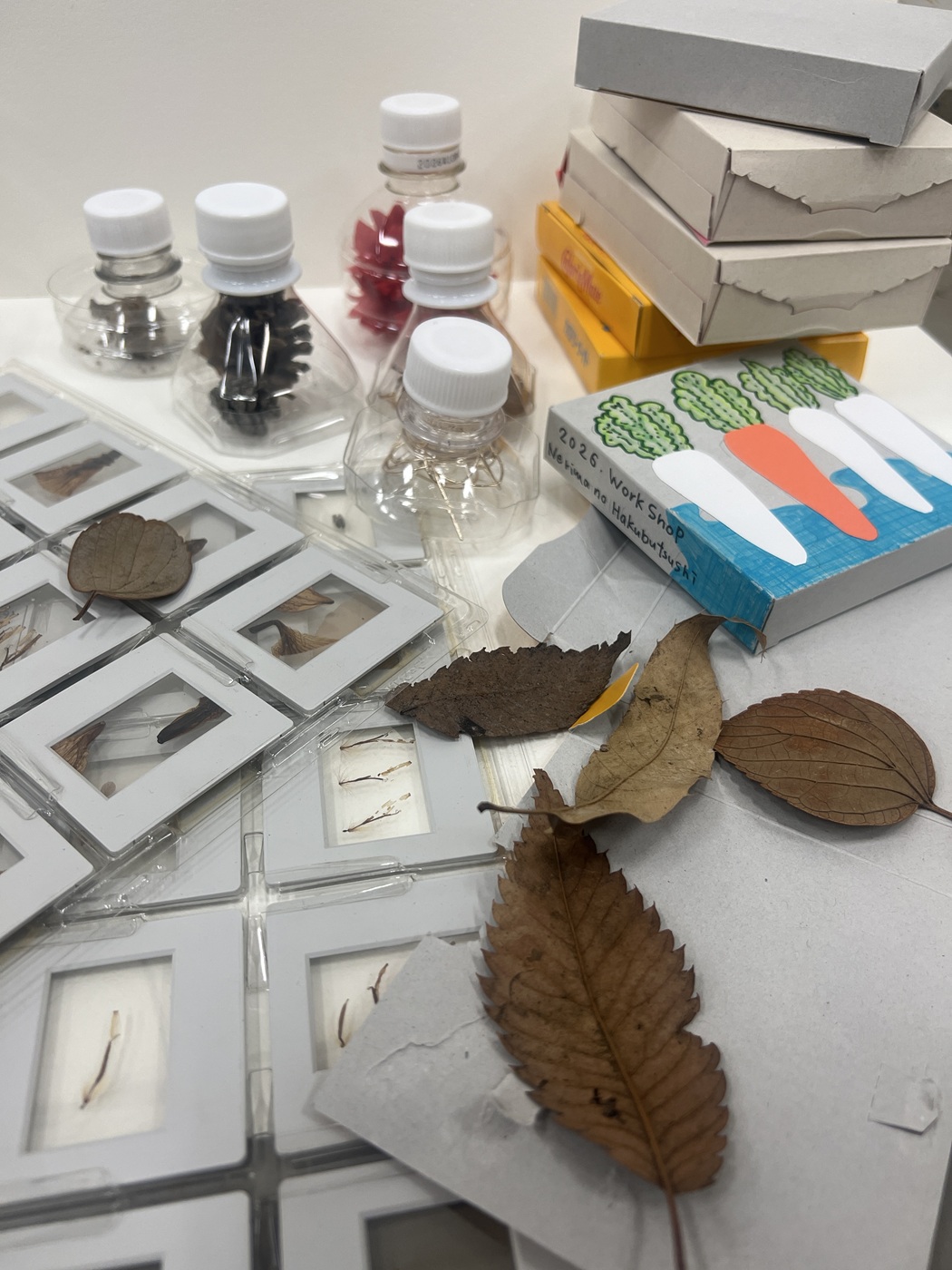 机の上にある紙やテープ、葉っぱやタネなどを、光と影を強調してみたら、どう見えるでしょうか?このワークショップでは、今回は身近なモノを挟み込み、懐かしのスライド映写機で楽しみます。