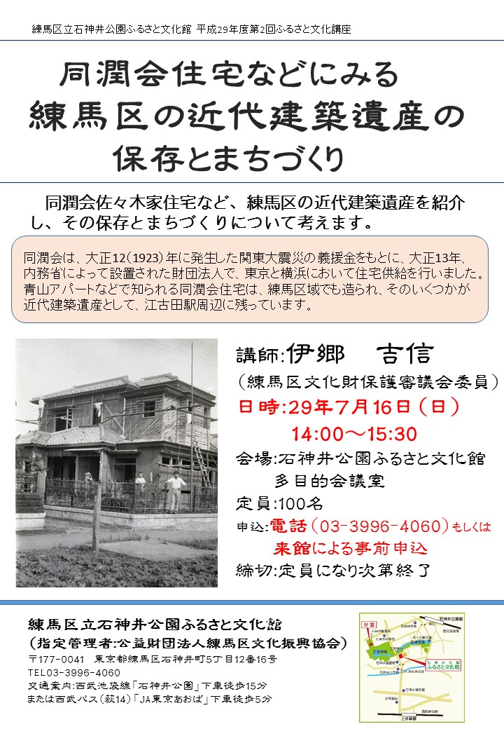 *同潤会は、大正12(1923)年に発生した関東大震災の義援金をもとに、大正13年、内務省によって設置された財団法人で、東京と横浜において住宅供給を行いました。 青山アパートなどで知られる同潤会住宅は、練馬区域でも造られ、そのいくつかが近代建築遺産として、江古田駅周辺に残っています。