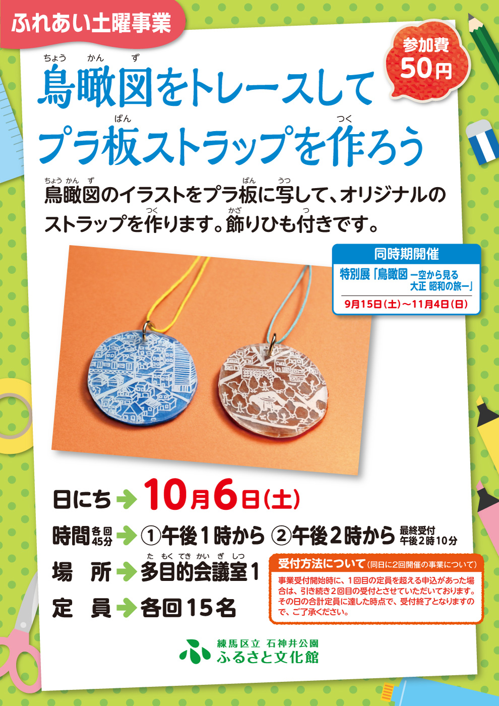 鳥瞰図のイラストをプラ板に写して、オリジナルのストラップを作ります。飾りひも付きです。日にち: 10月6日(土)