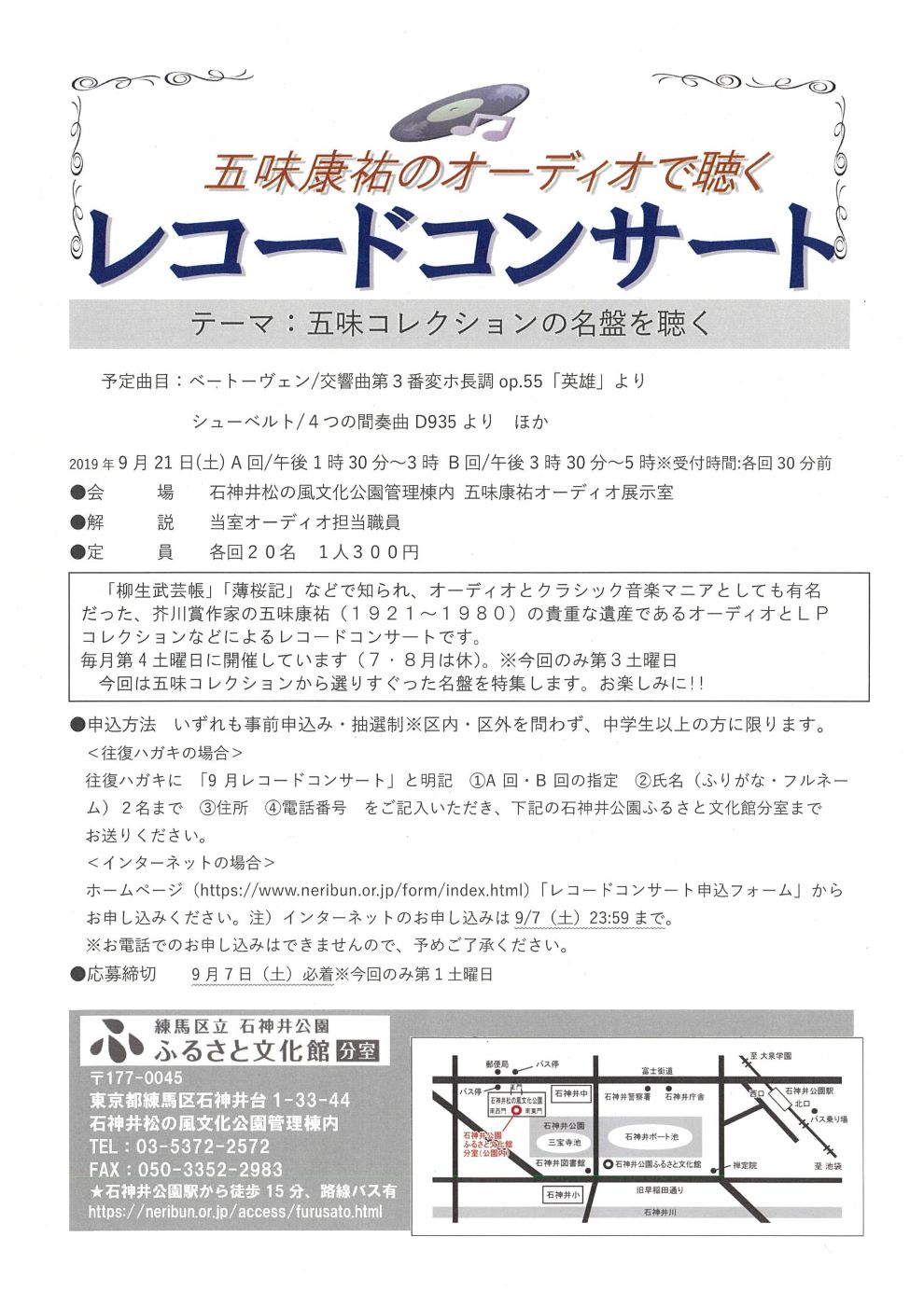 ●申込方法○往復はがきの場合①「9月レコードコンサート」(A・B回の別も)