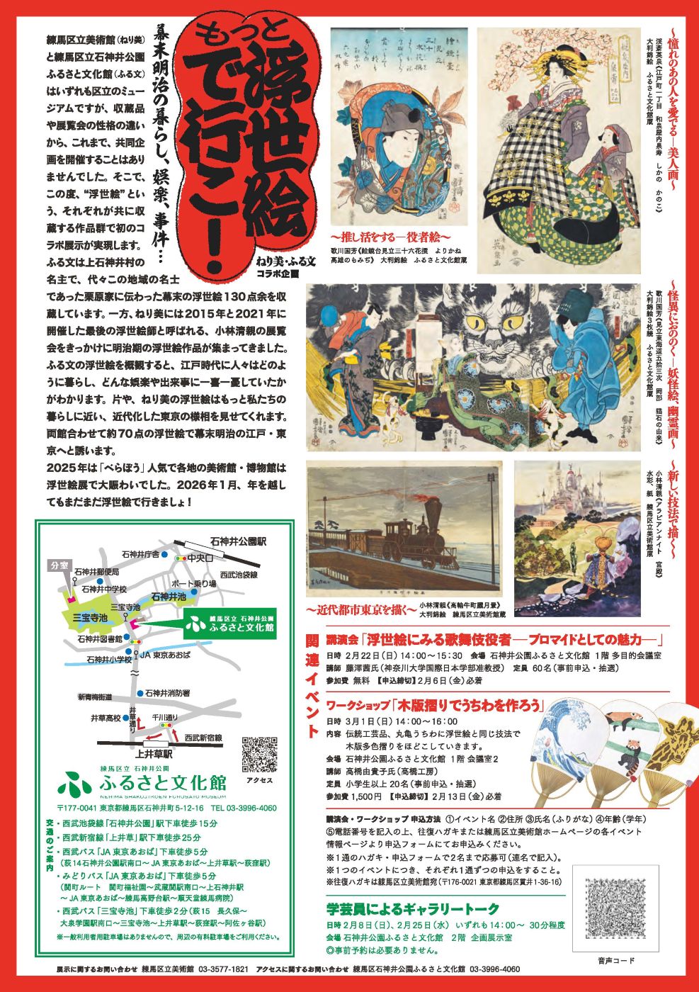 練馬区立美術館(ねり美)と練馬区立石神井公園ふるさと文化館(ふる文)はいずれも区立の ミュージアムですが、収蔵品や展覧会の性格の違いから、これまで、共同企画を開催することは ありませんでした。そこで、この度、“浮世絵”という、それぞれが共に収蔵する作品群で 初のコラボ展示が実現します。 2025 年は NHK 大河ドラマ「べらぼう」人気で各地の美術館・博物館は浮世絵展で大賑わいでし た。2026 年1月、年を越してもまだまだ浮世絵で行きましょ!