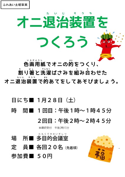 色画用紙でオニの的をつくり、割り箸と洗濯ばさみを組み合わせたオニ退治装置で的あてをしてあそびましょう。 日にち:1月28日(土) 時 間:①13時~ ②14時~ 場 所:多目的会議室 定 員:各回20名(先着順) 参加費:50円 受 付:開始時刻の10分前から。     (※最終受付は、14時15分。)