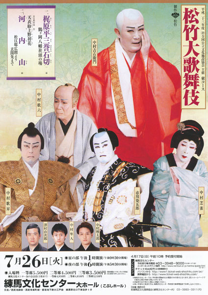 【公演中止のお知らせ】7月26日(火)に練馬文化センター大ホールにて予定されていました松竹大歌舞伎(昼・夜の2公演)は、3月29日の夜に松竹株式会社と東京都公立文化施設協議会の協議の結果、練馬文化センターを含む加盟施設において公演を中止することになりました。