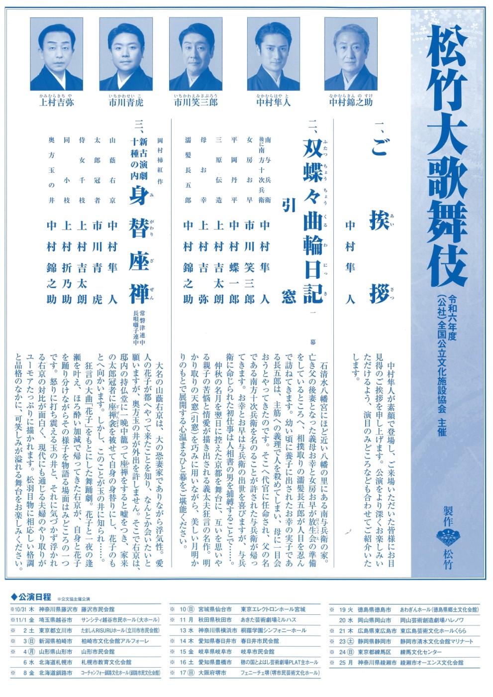 コロナ禍を経て2年前に開催された舞踊公演に続き、「松竹大歌舞伎」としては5年ぶりの巡業公演となります。この機会をお見逃しなく!■日時