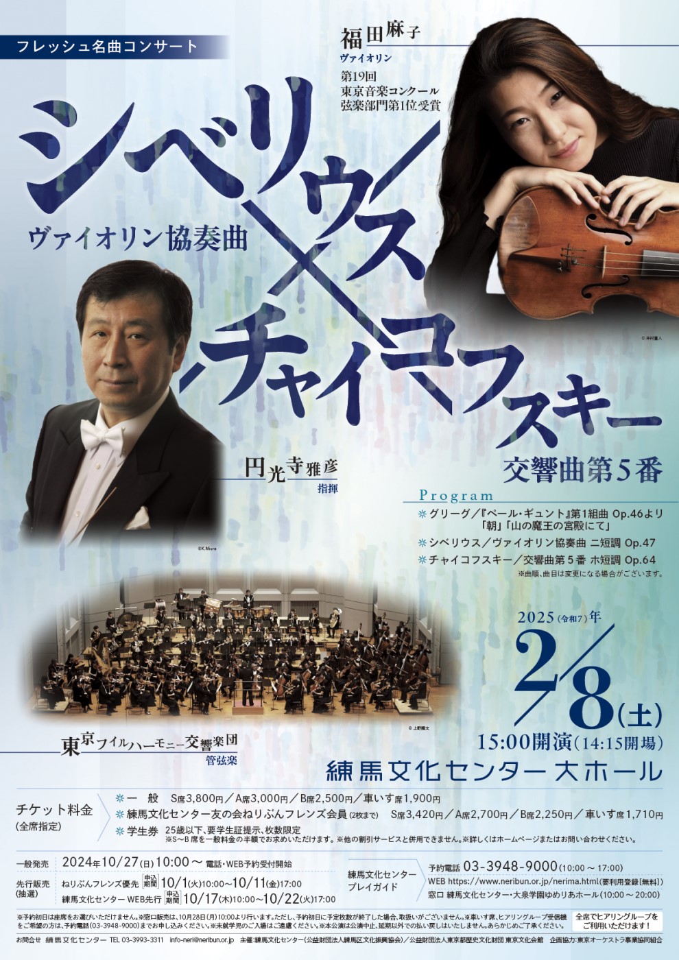 独奏には第19回東京音楽コンクール弦楽部門第1位を受賞した福田麻子が登場し、巨匠シベリウスが残したヴァイオリン協奏曲の極北に挑みます。さらに、チャイコフスキーの名曲《交響曲第5番》を、マエストロ円光寺雅彦×東京フィルハーモニー交響楽団による演奏でお届けします。