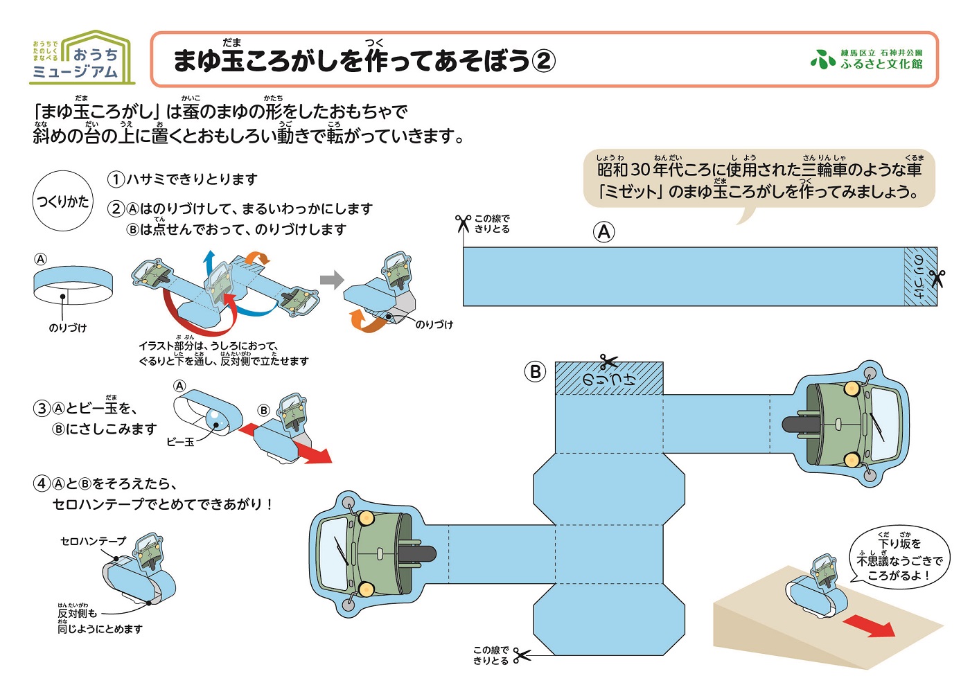 「まゆ玉ころがし」は絹の原料となる蚕(カイコ)のまゆの形をしたおもちゃです。斜めの台の上に置くと、三輪車のような車「ミゼット」がおもしろい動きをしながら、転がり落ちていきます。