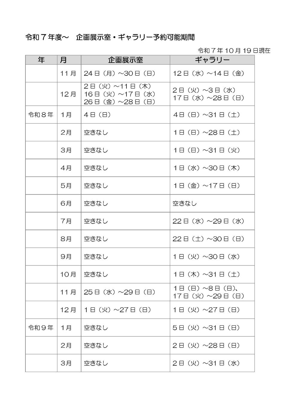 貸出可能な期間を右記表の通りお知らせいたします(10月19日現在)。